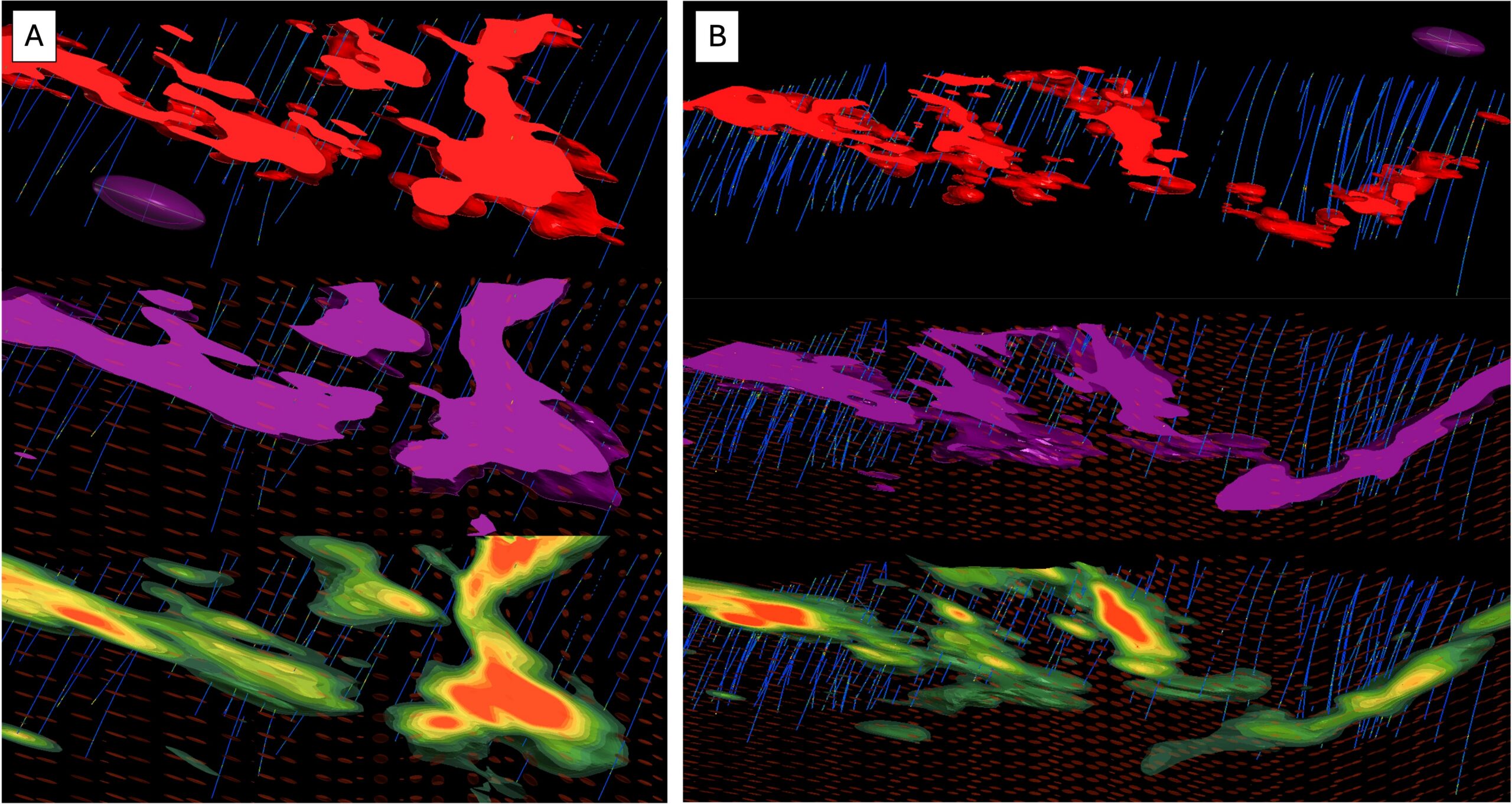 Figura 3: Comparación entre los dominios implícitos de Leapfrog y los modelos numéricos construidos mediante Triaxial-Blending Structural Trend informado por Driver (colores púrpura y cálidos), frente al buzamiento global heredado (rojo). Los resultados delinean la estructura de pliegue invertido en el área propuesta para la explotación minera futura (A). y un amplio sinclinal abierto en el norte (B).