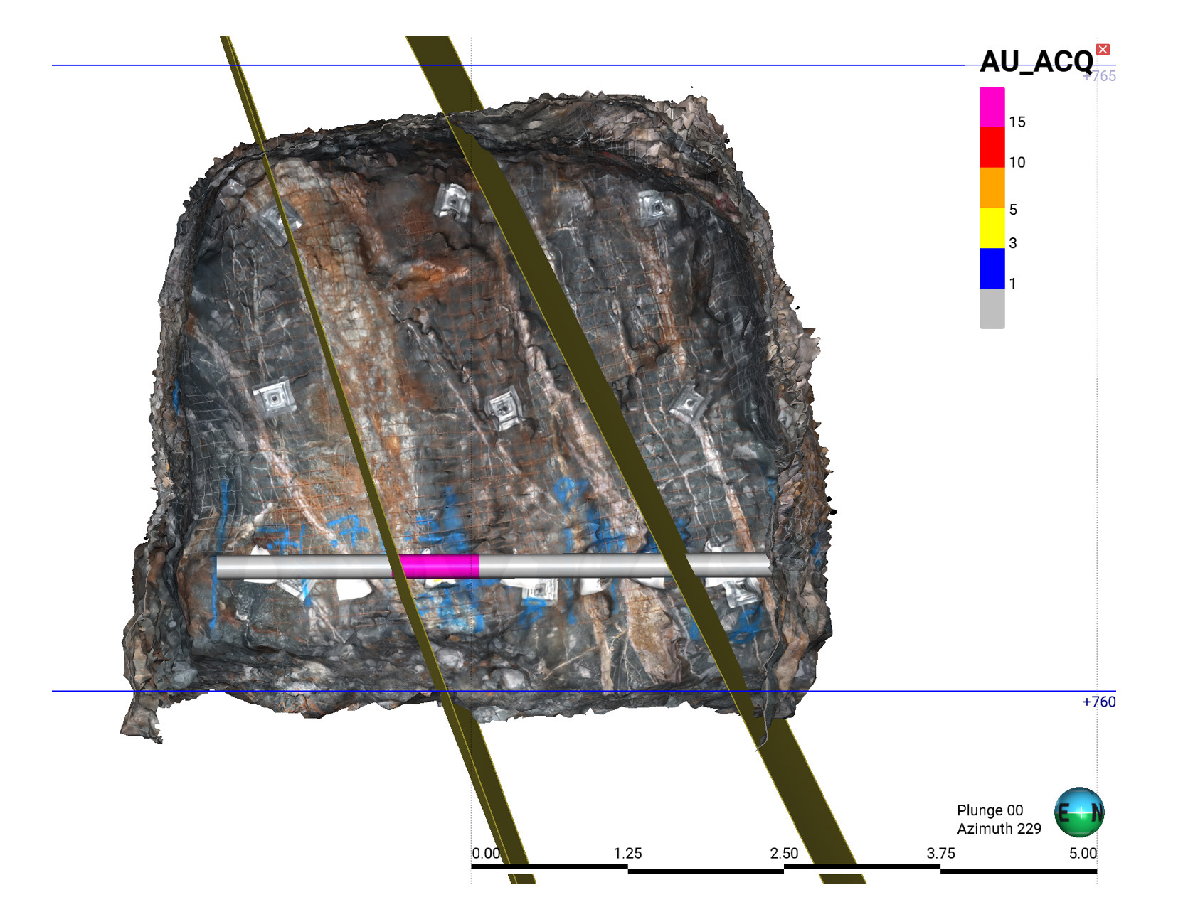 На модели Leapfrog выше показано выявленное ответвление жилы на подземном участке Ваихи компании OceanaGold. Розовая область указывает на канал, где была получена проба золота с высоким содержанием полезного компонента.